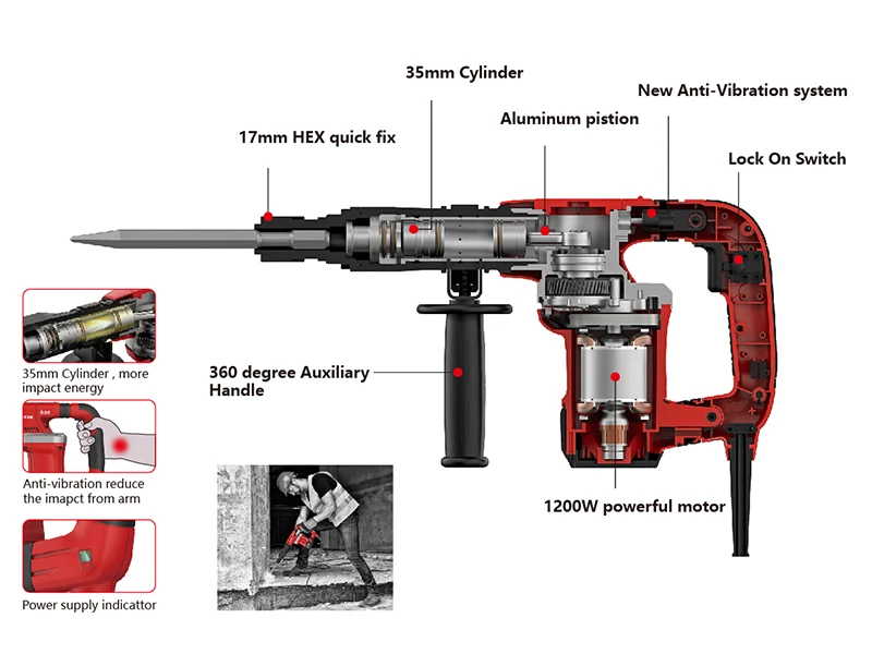 ● Chiseling angle adjustable by 12-steps lock; enabling you to adapt it to each work situation. (e.g. when using tile chisels)