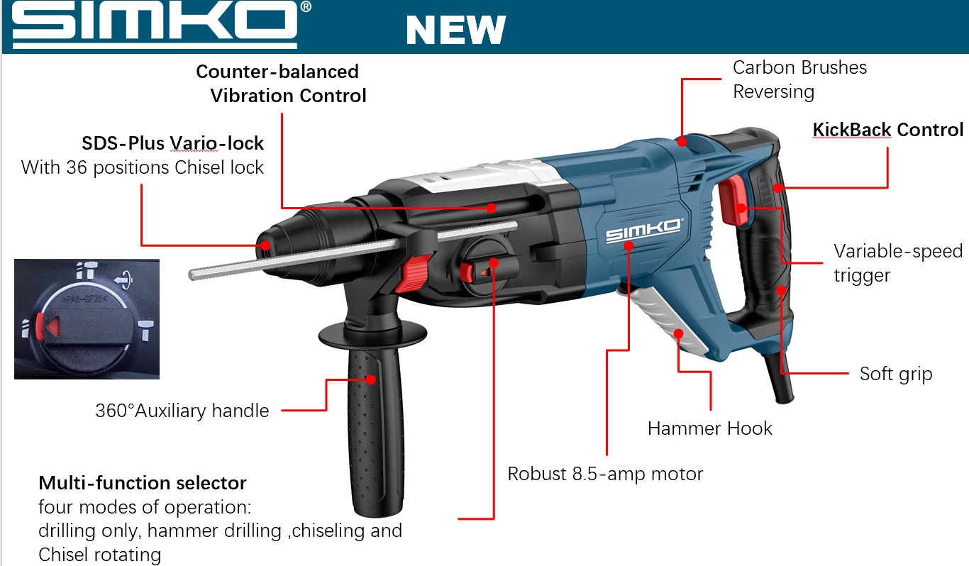 ● Counter-balanced Vibration Control(SR290-28PA/B) – improves user comfort during drilling or chiseling applications.